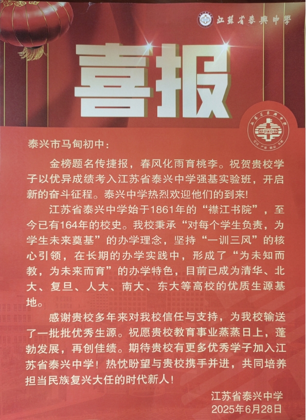 在2025年中考中,马甸初中初三(1)班卜鲁轩同学以优异成绩进入江苏省泰兴中学2025级高一“强基”实验班。